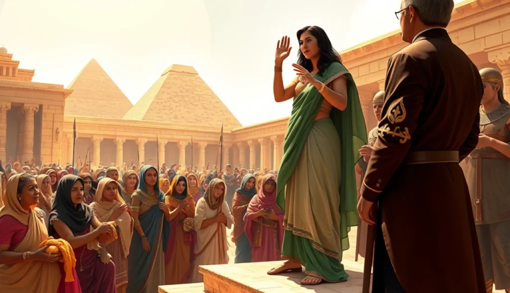 Em vez de me deixar abater, decidi que era hora de agir. Juntei-me a outras mulheres comerciantes para protestar contra a injustiça do novo regulamento. Com coragem, fomos à praça central, onde a multidão se dispersava após o anúncio do decreto. Com minha voz firme, clamei por nossos direitos e pela igualdade que todas nós merecíamos. A resposta foi poderosa; mulheres se uniram a mim, e o clamor por justiça ecoou pelas ruas de Babilônia.
