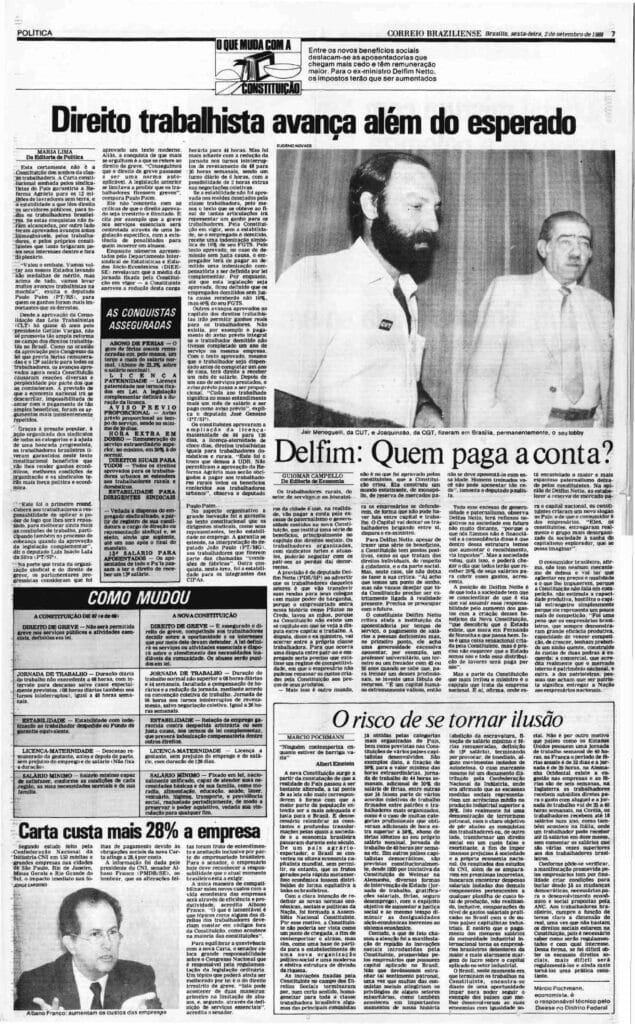 A edição de 2 de setembro de 1988 do jornal Correio Brasiliense “Quem paga a conta?”, Delfim Netto fez duras críticas sobre os direitos trabalhistas da Constituição de 1988, apontando os riscos econômicos das generosas concessões feitas aos trabalhadores, sem considerar as condições fiscais do país para sustentá-las. Segundo ele, a Constituição representava um excesso de paternalismo e generosidade, já que oferecia um aumento substancial dos direitos sociais sem garantir que a economia brasileira fosse capaz de arcar com isso. Ele afirmou que a expansão dos direitos sociais seria uma carga pesada para o país, e que “o que é bom para os trabalhadores, no curto prazo, pode ser um veneno no longo prazo, quando a conta vem”. Para Delfim, a Constituição de 1988 favorecia os trabalhadores organizados, mas deixava os mais vulneráveis, sem forte poder de barganha, com a responsabilidade de pagar a conta, através de uma alta carga tributária necessária para financiar os novos benefícios. A crítica central de Delfim era de que a Constituição afastava os empresários da equação, dificultando a competitividade das empresas ao impor uma série de regalias que comprometiam a sustentabilidade econômica.