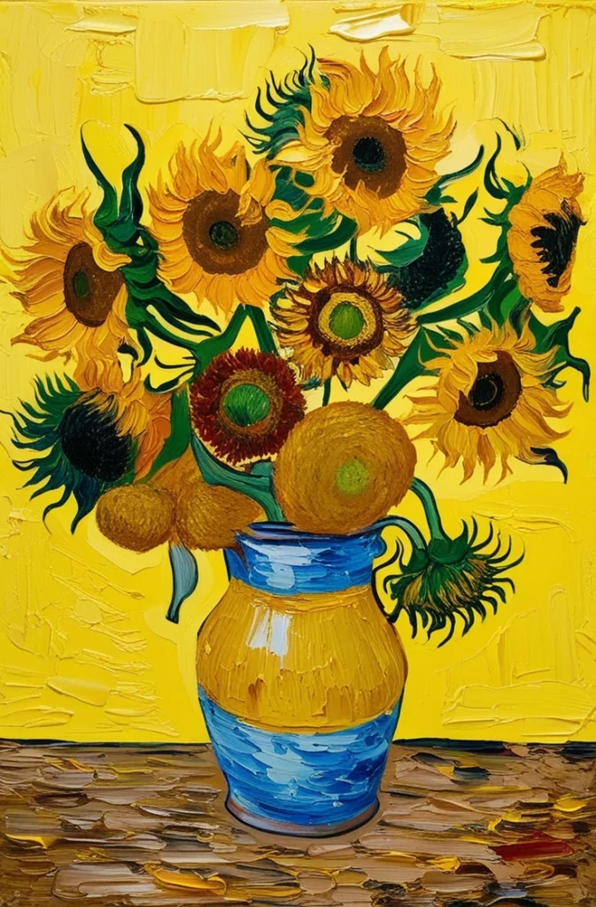 Sabe aquele quadro famoso que tem vários girassóis enormes e amarelos, com um fundo vibrante que quase parece brilhar? Então, ele é um dos mais incríveis da história da arte! Essa obra não é só sobre flores, mas sobre energia, vida e até os altos e baixos do próprio artista que a pintou. É como se ele tivesse colocado todas as emoções dele ali na tela. Eu dependendo do dia que olho acho que os girassóis estão fortes e bonitos e outras penso que estão pra baixo. A pintura parece tão simples, mas, ao mesmo tempo, tem um impacto gigante. Responda a questão abaixo, teste seu conhecimento sobre Girassóis de ?