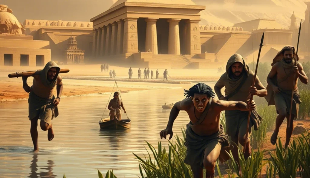 Com coragem, decidi correr em direção ao rio Nilo, onde a esperança de escapar me aguardava. A adrenalina pulsava em minhas veias enquanto eu deixava para trás o peso das pedras e os olhares incrédulos de meus companheiros. O Nilo, com sua beleza serena, se aproximava, e eu sabia que lá poderia encontrar aliados.