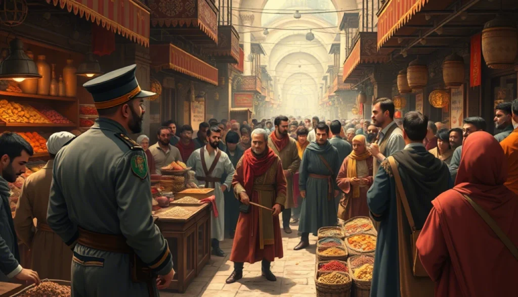 Enquanto você navega pelas barracas coloridas, uma agitação repentina chama sua atenção. Um grupo de mercadores se reúne em torno de um homem que parece estar em apuros, acusando-o de contrabando de especiarias valiosas. O tumulto é palpável, e a tensão aumenta à medida que um oficial da polícia otomana se aproxima para prender o homem. Você observa a cena com cautela, sentindo o peso da situação.